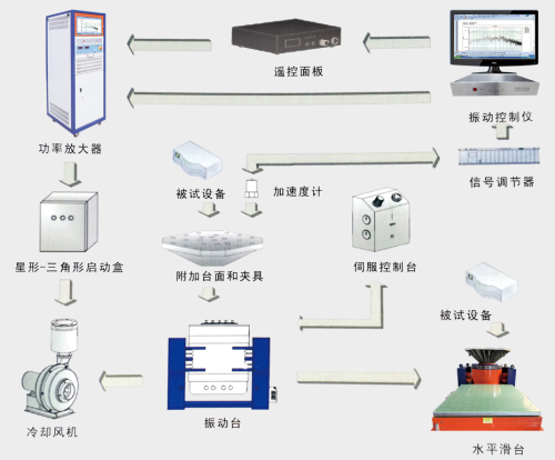 振動臺系統(tǒng)有幾大部分組成功率放大器(簡稱功放)控制儀、振動臺、附加臺面及夾具、制冷單元(有冷卻風機、水冷裝置)、傳感器、水平滑臺。